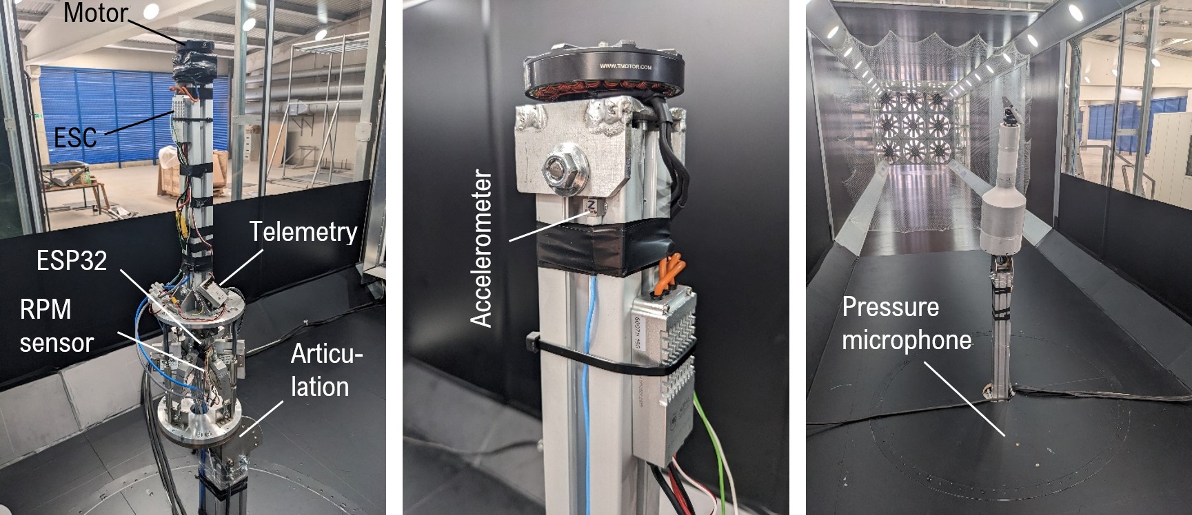 Aerodynamic forces and moments created by the propeller at different advance ratios and flow angles are measured through a custom balance, which is fixed directly to the concrete floor the facility with extruded aluminium profiles. Readings from the load cells of the balance are directly acquired through a National Instruments DAQ system. To this custom bal-ance, the motor and propellers were affixed through an extruded aluminium profile, which was then covered by a custom 3D printed fairing. In turn, the balance was affixed to a support beam through an articulation, which allowed repositioning the propeller at the required angles with respect to the wind direction.