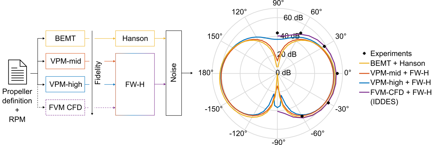 The first work package of ENOLA is focused on multi-fidelity propeller modelling, testing and optimization. In this recent work, presented at the AIDAA-CEAS conference in Torino, multi-fidelity numerical acoustic optimization of UAV propellers, we present a unified methodology to efficiently optimize fixed-pitch propellers operating at low Reynolds numbers. The proposed approach integrates Blade Element Momentum Theory (BEMT) coupled with the Hanson formulation for tonal noise as a low-fidelity model, and a Vortex Particle Method (VPM) coupled with an FW–H acoustic solver as a higher-fidelity alternative. The model is also prepared for high-fidelity VPM and FVM (CFD) simulations. All are driven by a common geometric definition, enabling automated multi-level simulations from the same propeller description. The methodology was experimentally validated in the anechoic chamber at CMT using a 9-inch commercial propeller, showing good agreement in blade-passing-frequency directivity patterns and highlighting the benefits of higher-fidelity simulations for upstream noise prediction.
