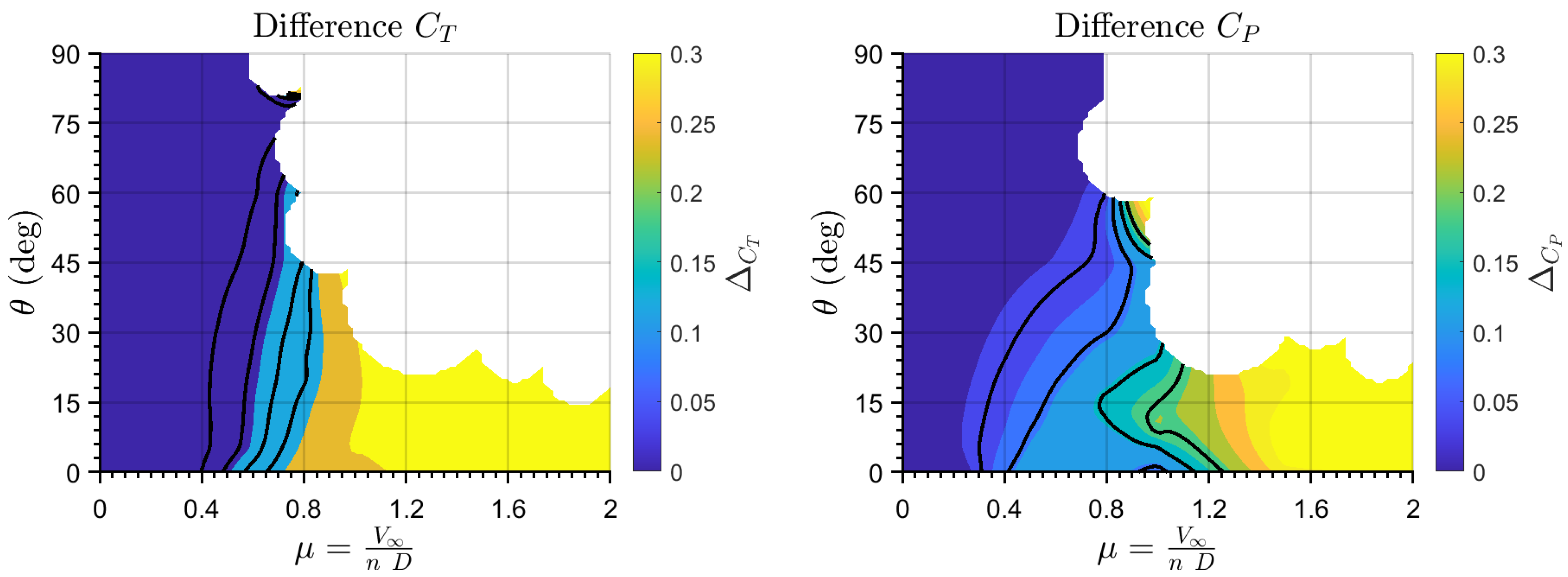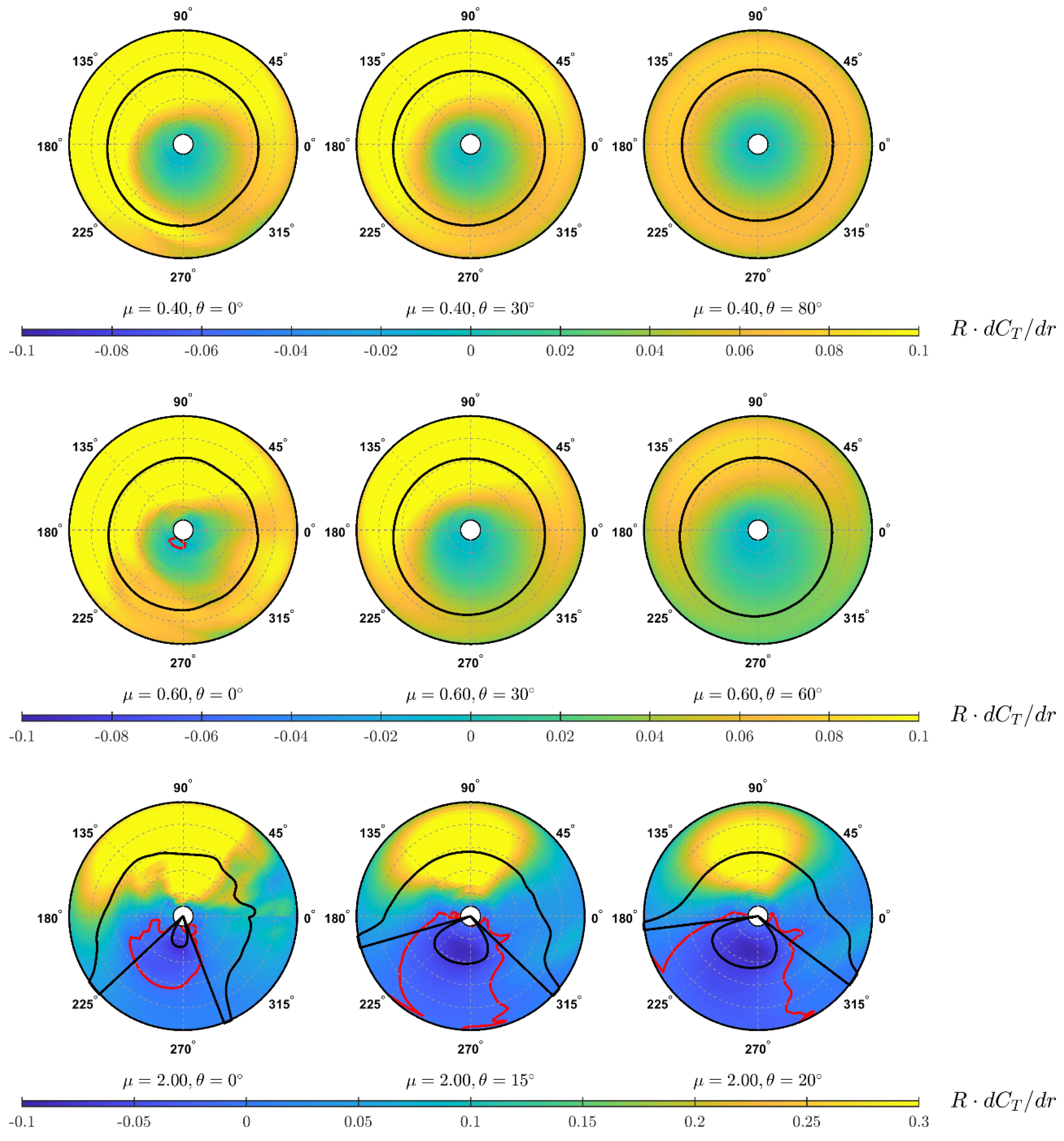 - Identifies the applicability limits of the MRF model, particularly in high-speed edgewise flight where aerodynamic asymmetry becomes extreme. Figure 2 illustrates this phenomenon through polar maps, highlighting the expansion of negative thrust regions and the shift in the Center of Pressure (CoP) as the advance ratio increases.