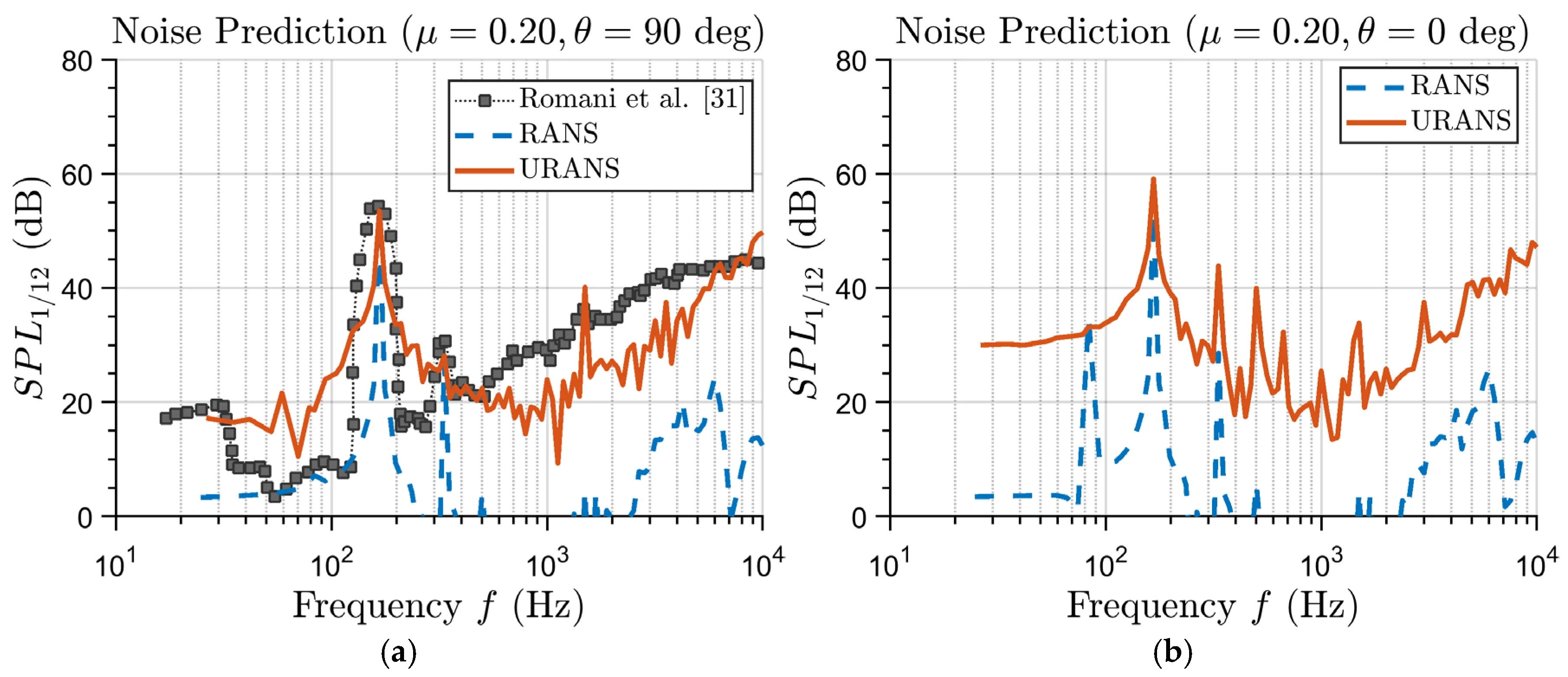 Furthermore, the work incorporates an aeroacoustic evaluation based on the Ffowcs Williams–Hawkings analogy. Figure 3 compares the predicted Sound Pressure Level (SPL) spectra, demonstrating that while both methods capture dominant tonal peaks at low advance ratios, the MRF approach can introduce specific artifacts due to interface pressure non-uniformity.